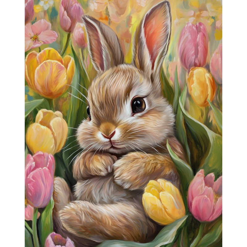 schattig konijn liggend in tulpen